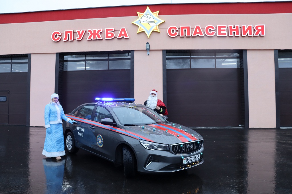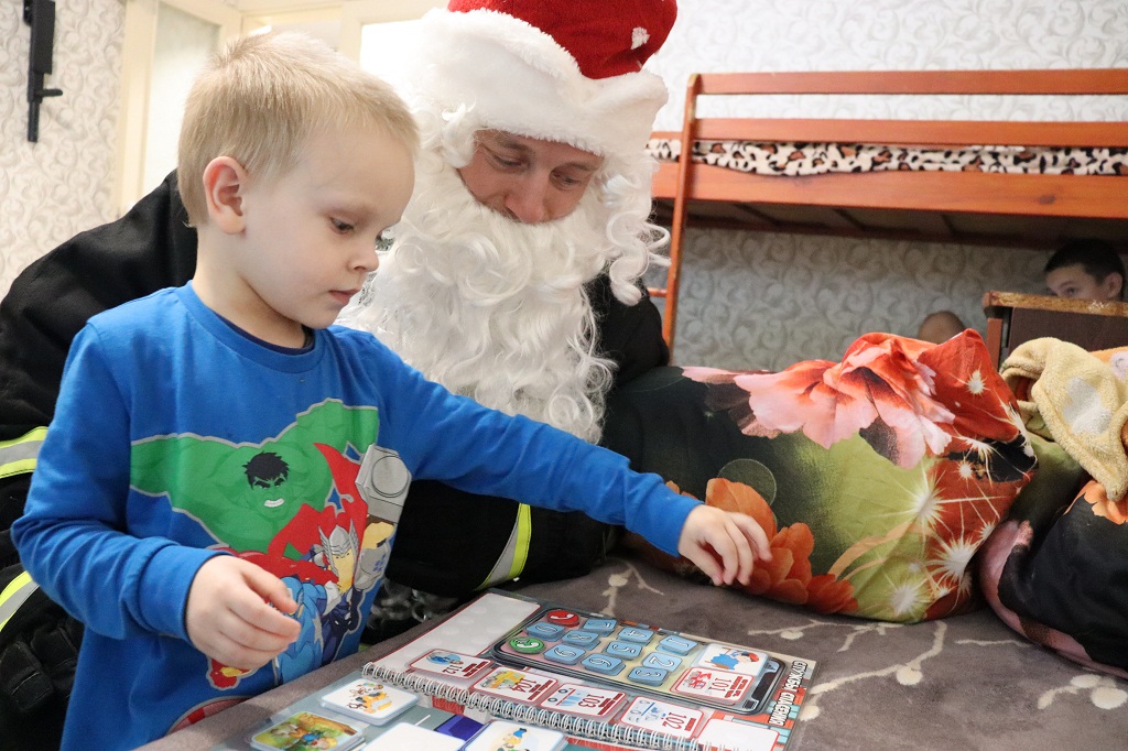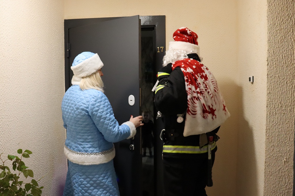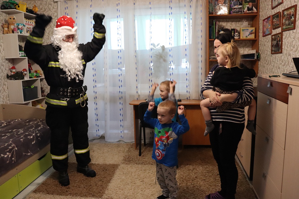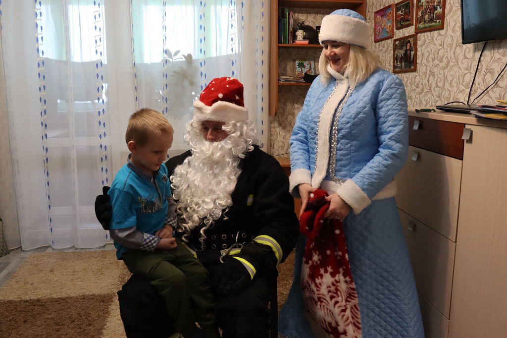 Звук сирены, проблеск маячков. Пожарный Дед Мороз и Снегурочка прибыли по указанному адресу на украшенном спецтранспорте. Звонок в дверь и на пороге неожиданные гости. На лицах детворы сначала недоумение, удивление, затем радостные восклицания: «Ура!!!»