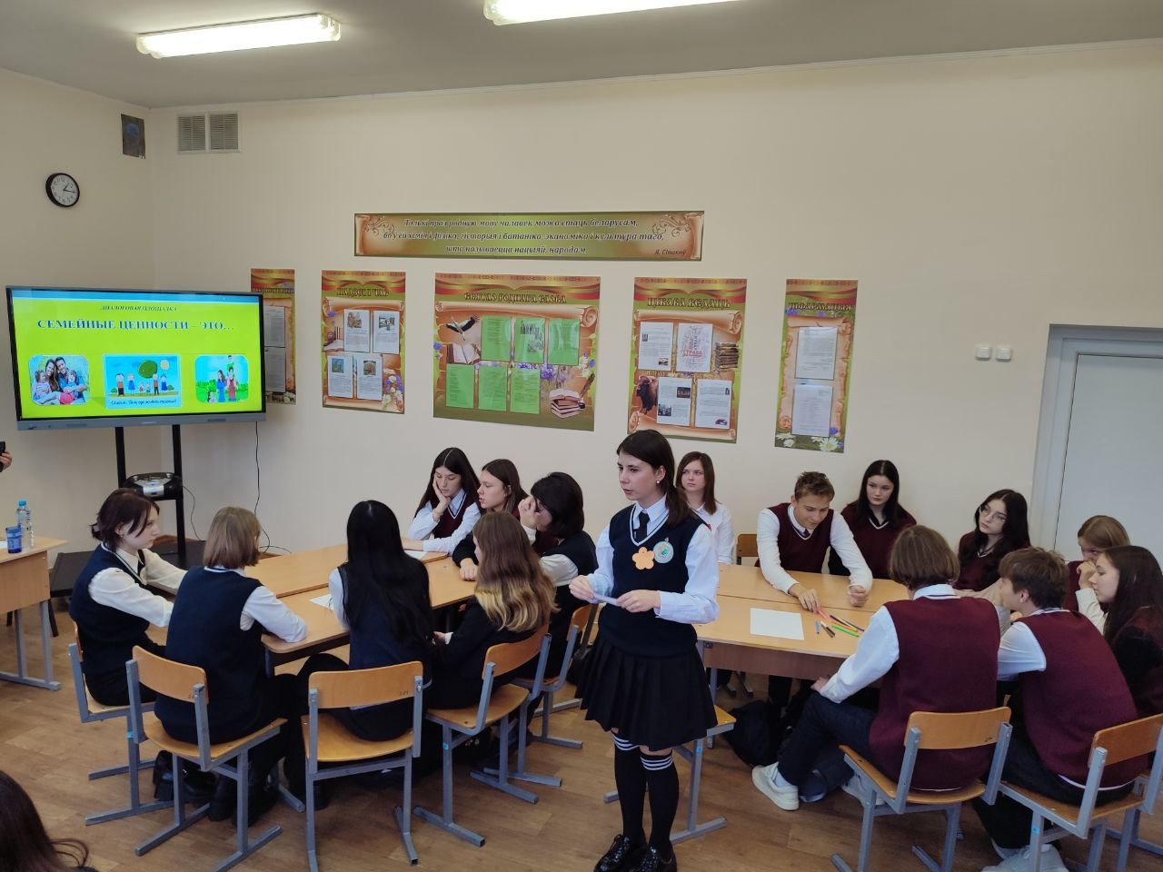 В ходе мероприятия обсуждались такие вопросы как: «Важность семьи для человека», «Роль отца в жизни ребенка», «Гражданский брак и сожительство», «Дети и семья». В конце мероприятия учащиеся составили формулу счастливой семьи, в которой нашли отражение такие семейные ценности как любовь, доброта, понимание, уважение, забота.
