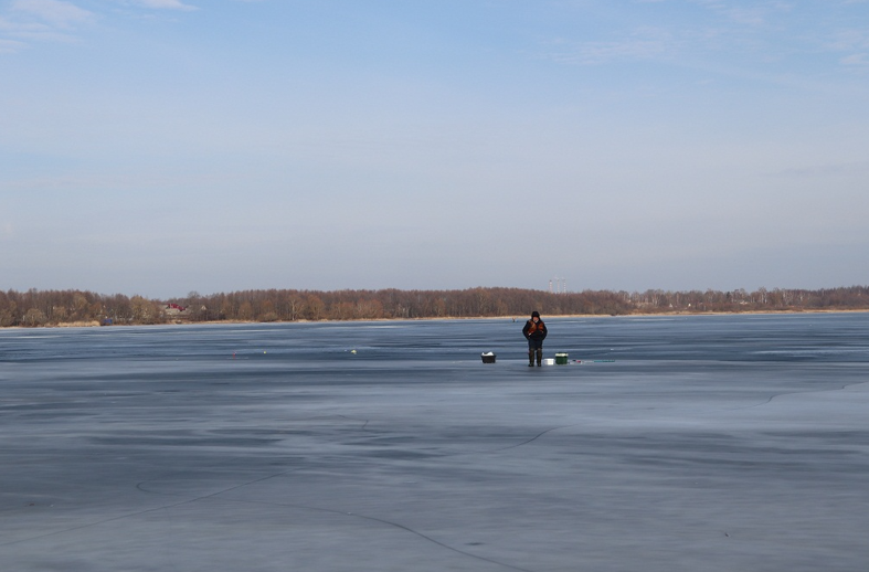Вдалеке еще один любитель зимнего лова. Виден яркий жилет. Здесь полный порядок, и мы спокойно следуем к группе рыбаков недалеко от острова. По 2 – 3 человека они рассредоточены по поверхности ледяного покрытия.