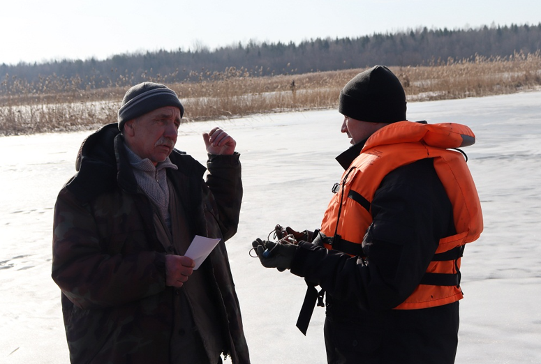 Долго искать не пришлось – одинокий рыбак недалеко от островка. Профессиональный глаз сразу замечает: спасательного жилета нет. Приветствуем его и начинаем беседу о личной безопасности на льду. Владимир Валерьевич подчеркивает, что в соответствии с постановлением Совета Министров Республики Беларусь от 18 августа 2023 года №543 выходить на лед можно только в спасательном жилете, который в случае ЧС поможет удержаться на плаву до прихода помощи. Относительно безопасным считается лед от 7 сантиметров.